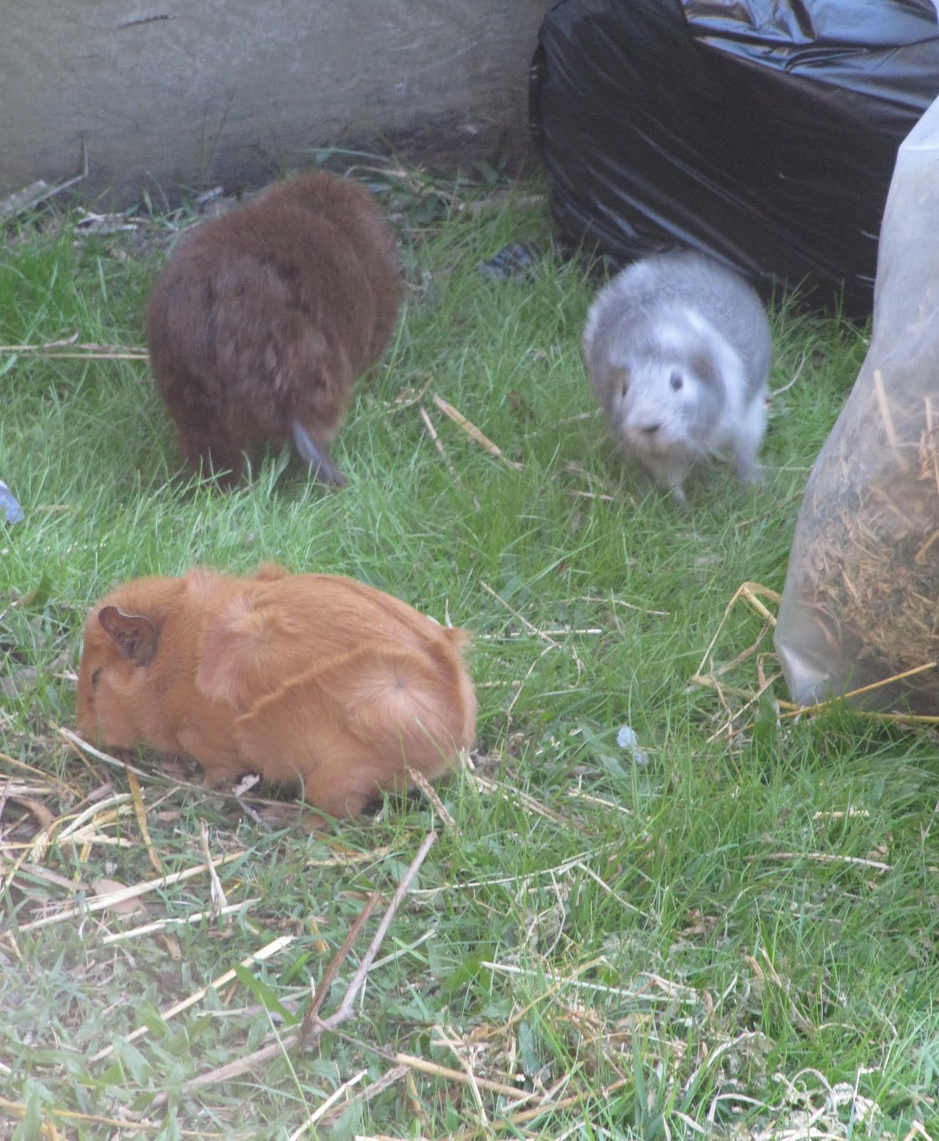 The top photo is Custard on 'baby sitting duty' while Subi and the others went outside to eat grass! Instinctively Bonnie stayed behind and buried herself in the straw making little chirping noises. I watched as Custard went back inside the cage and sat with her, cuddling up to her and gently nudging her to the corner to sit down. Pretty extraordinary behaviour for a piggy who's never had a litter before!